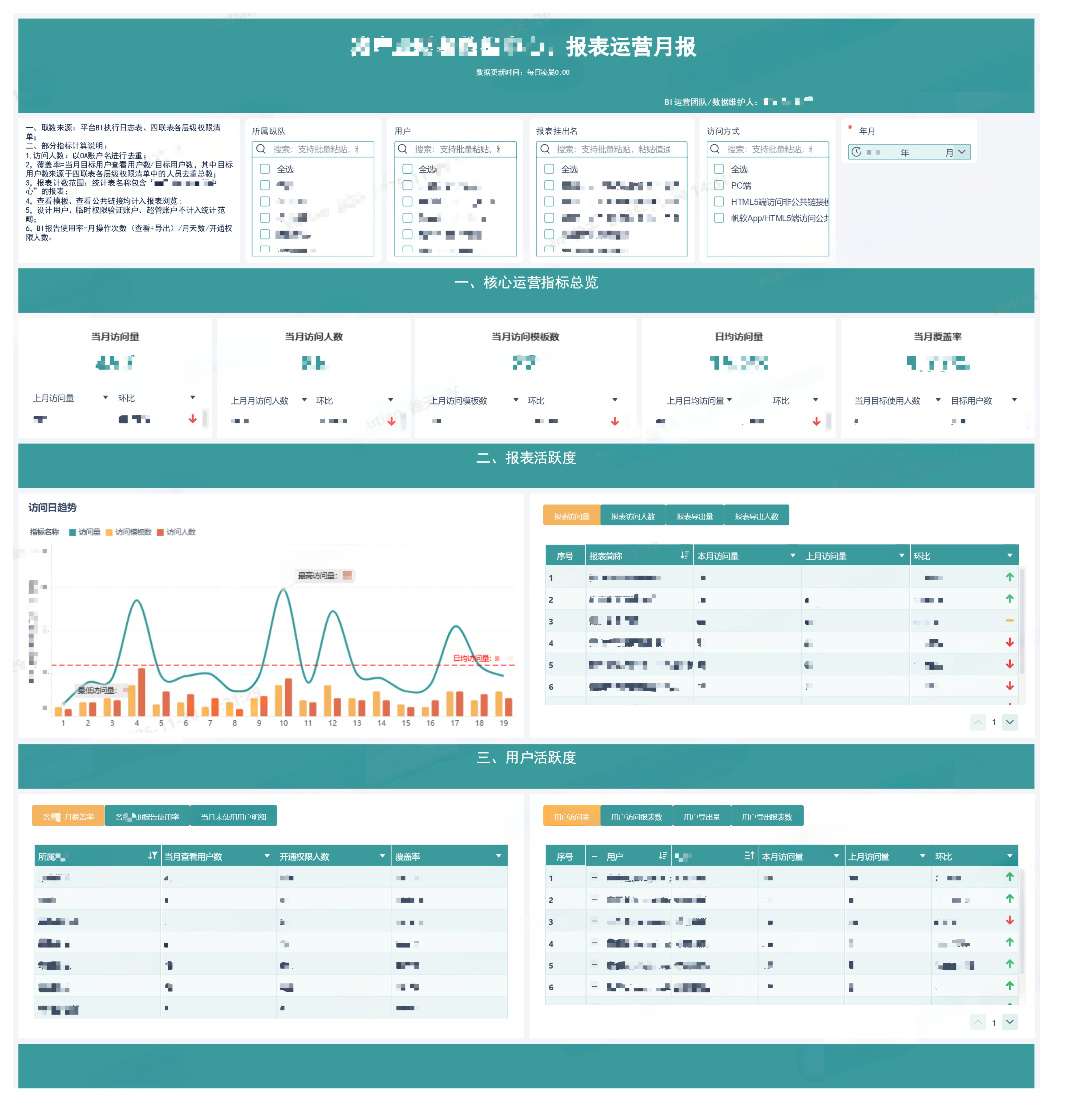 在BI工具成功“用起来”之后,一个更深层次的问题便浮现出来:BI的数据成果,到底怎样才能用起来?这里面有2个问题,目标用户是否有在用?以及他们是否觉得这个成果有价值而愿意持续使用。有些报表,只在上线时,一时热闹,随后却因个种缘由归于沉寂。