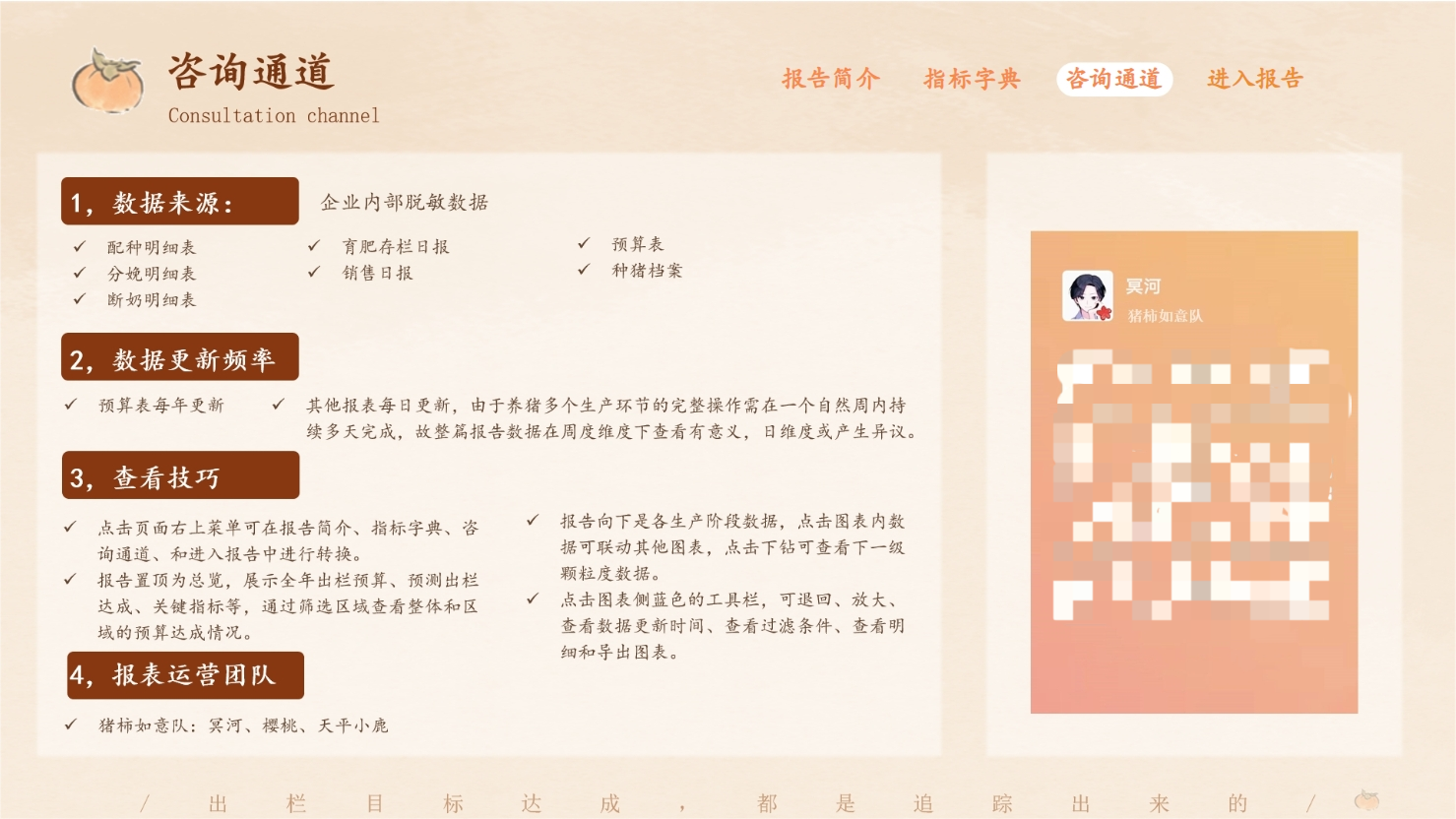 经过与数据产品经理的商议,在传统BI报告中,新增类似”数据产品使用说明书”的用户友好型功能块:(1)报告简介;(2)指标字典;(3)咨询通道;(4)培训视频。以此降低用户上手成本,提升用户使用体验。