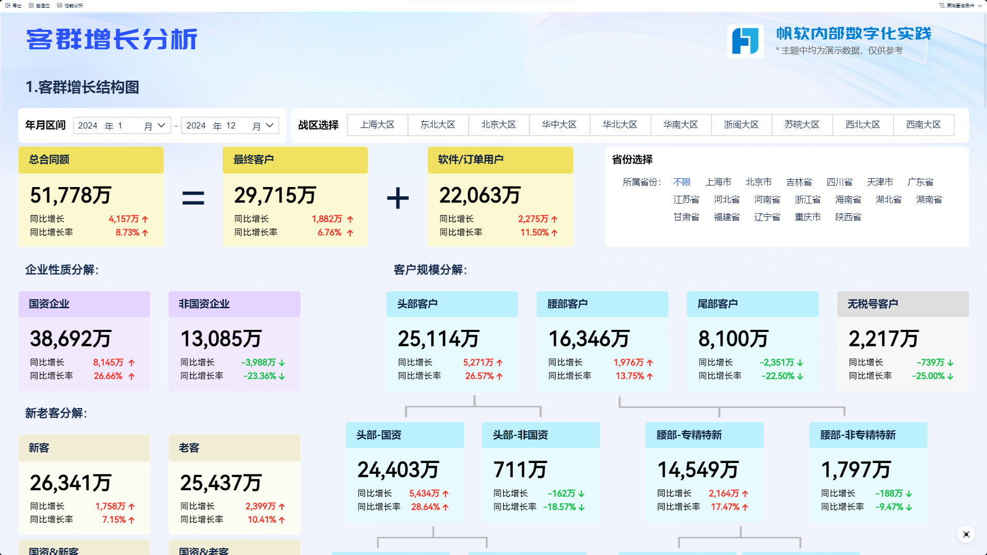 ● 客群增长分析:如何定位不同客群增长差异?定位洞察企业增长支点?在客群增长分析看板中,不同客群的增长、产值、贡献分层、风险点一目了然,“该盯紧哪个客群” 不再靠猜;