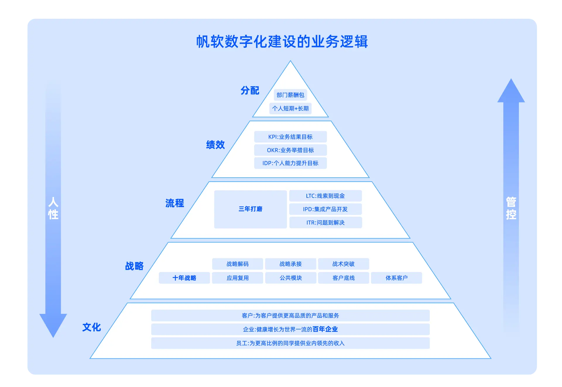 帆软看板不是 “数据可视化” 的 “花架子”,它的数字化建设业务逻辑金字塔早就把 “文化、战略、流程、绩效、分配” 层层打通。