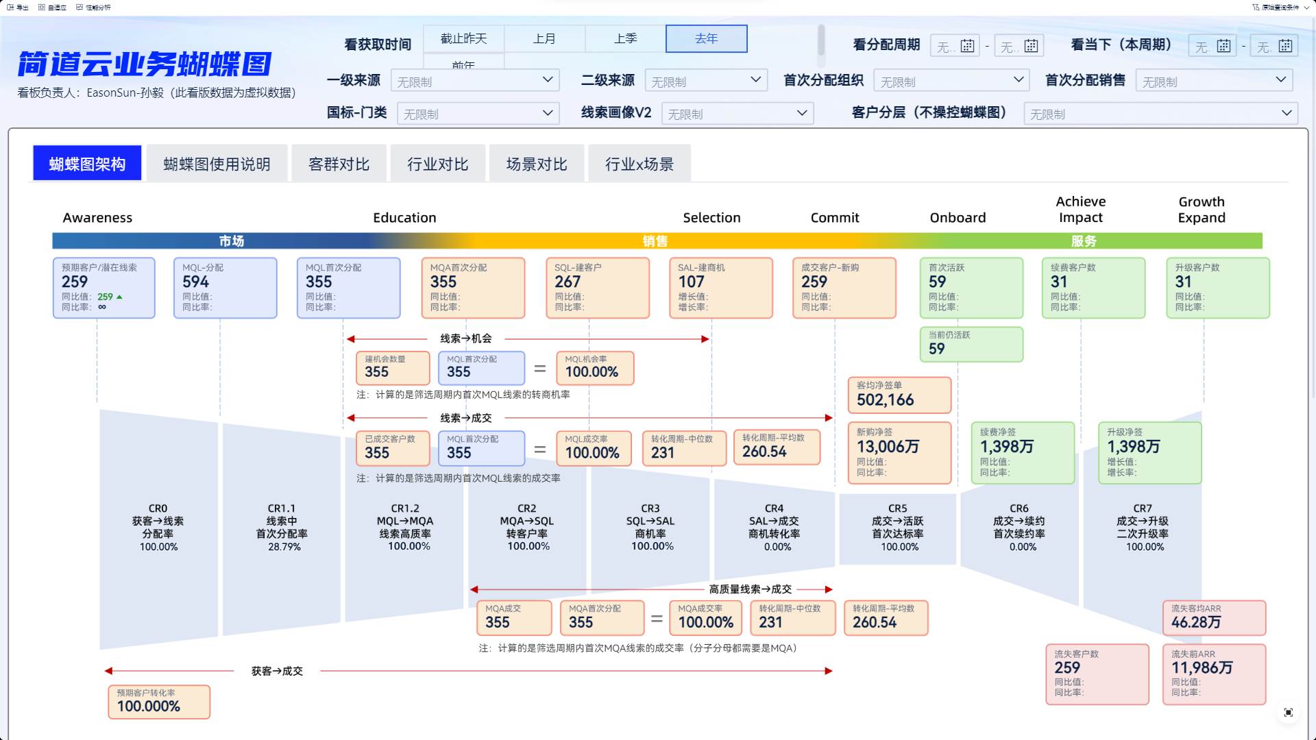 ● 简道云蝴蝶图分析模型:实现客户全生命周期与客群的深度剖析,从客户获取、LTC 流程到服务与二次产出,全链路数据整合,让企业清晰掌握客户经营效率;支持按行业、场景等多维度拆分客群,客群清不清楚,看一眼就懂;