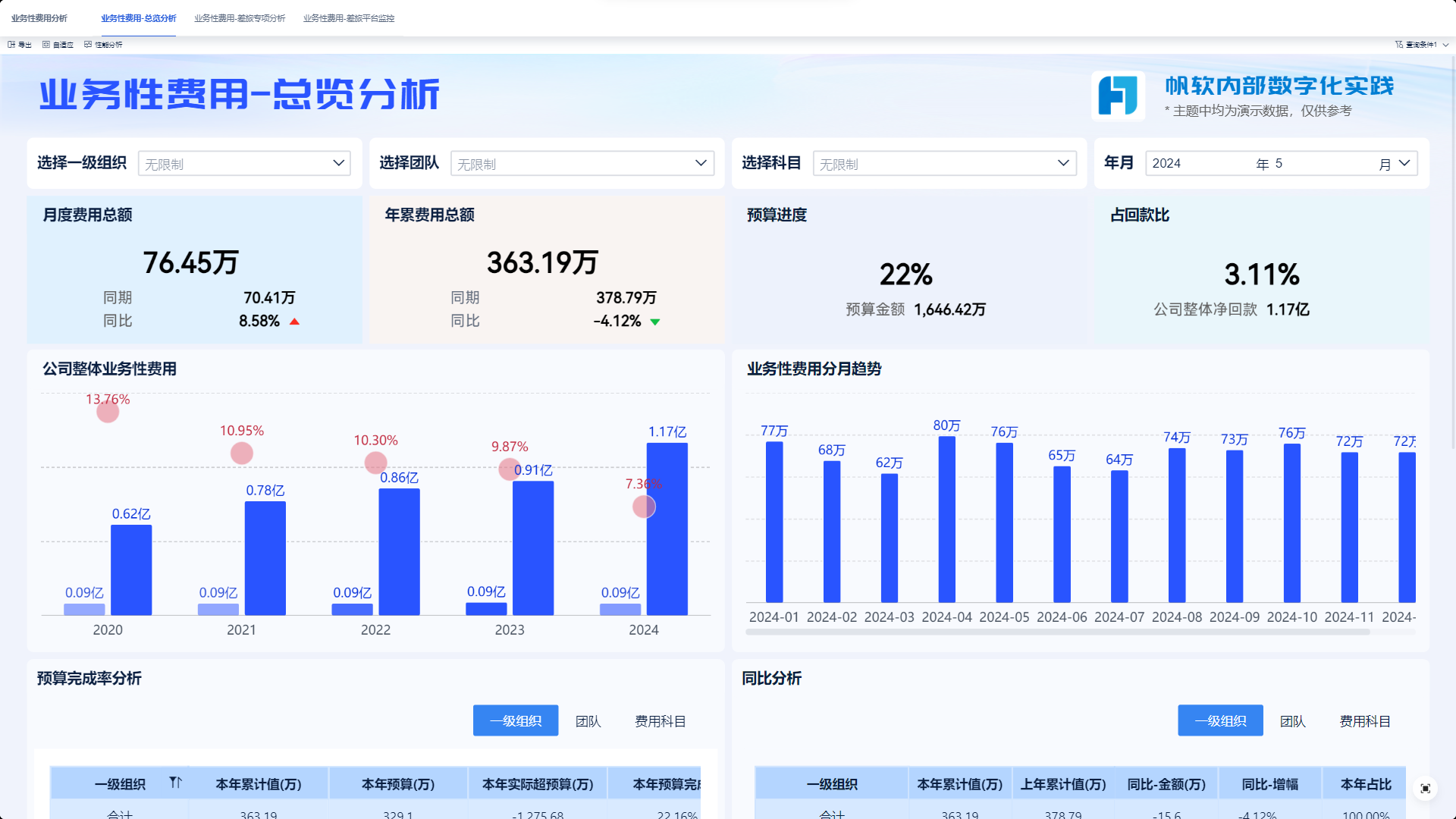 ● 业务性费用分析看板:业务性费用花了多少,超没超预算,费用分析看板一拉,费用管控清清楚楚。