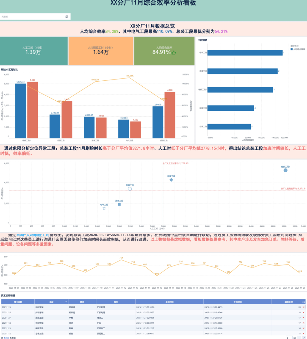 3. 时序与明细数据:通过日期-人均刷脸工时折线图观察到,总装工段在2025.11.10-2025.11.14期间加班量异常突出;联动员工加班明细表核查,确认该时段存在部分员工加班时长超标的情况。