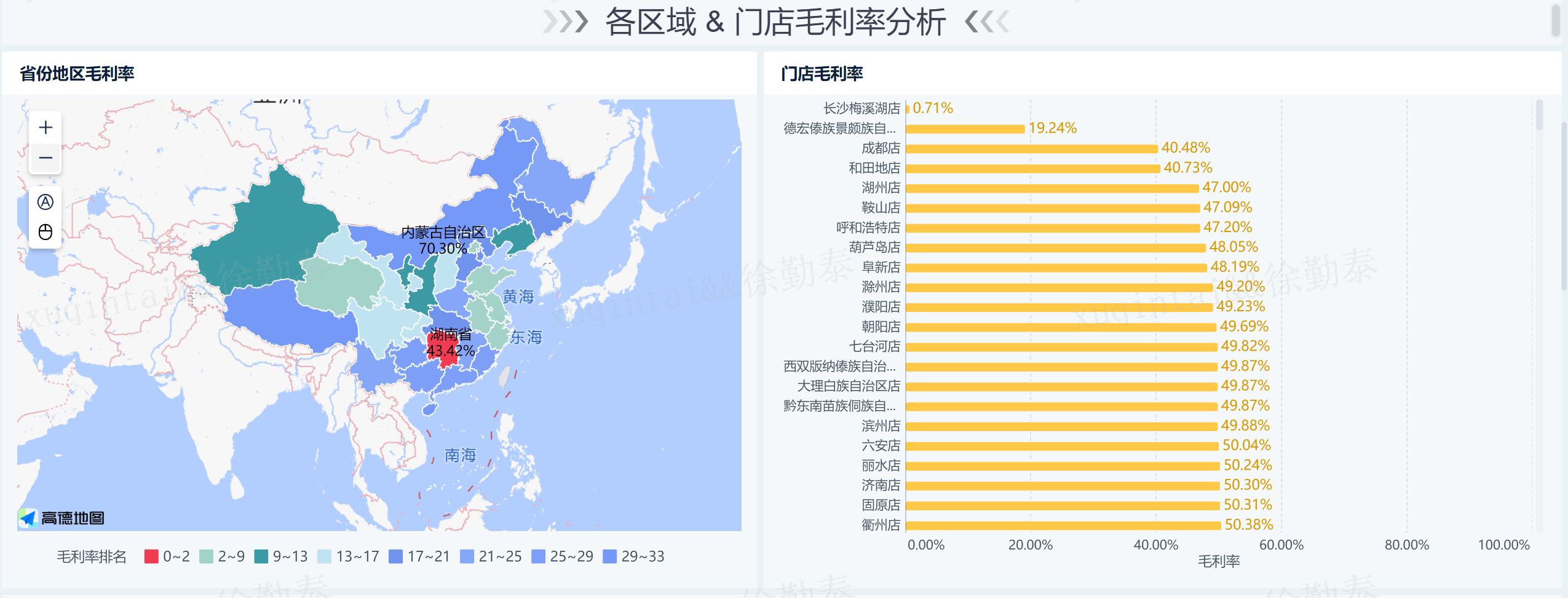 2、第二部分对各区域和门店毛利率进行分析,主要使用区域地图和条形图的形式。