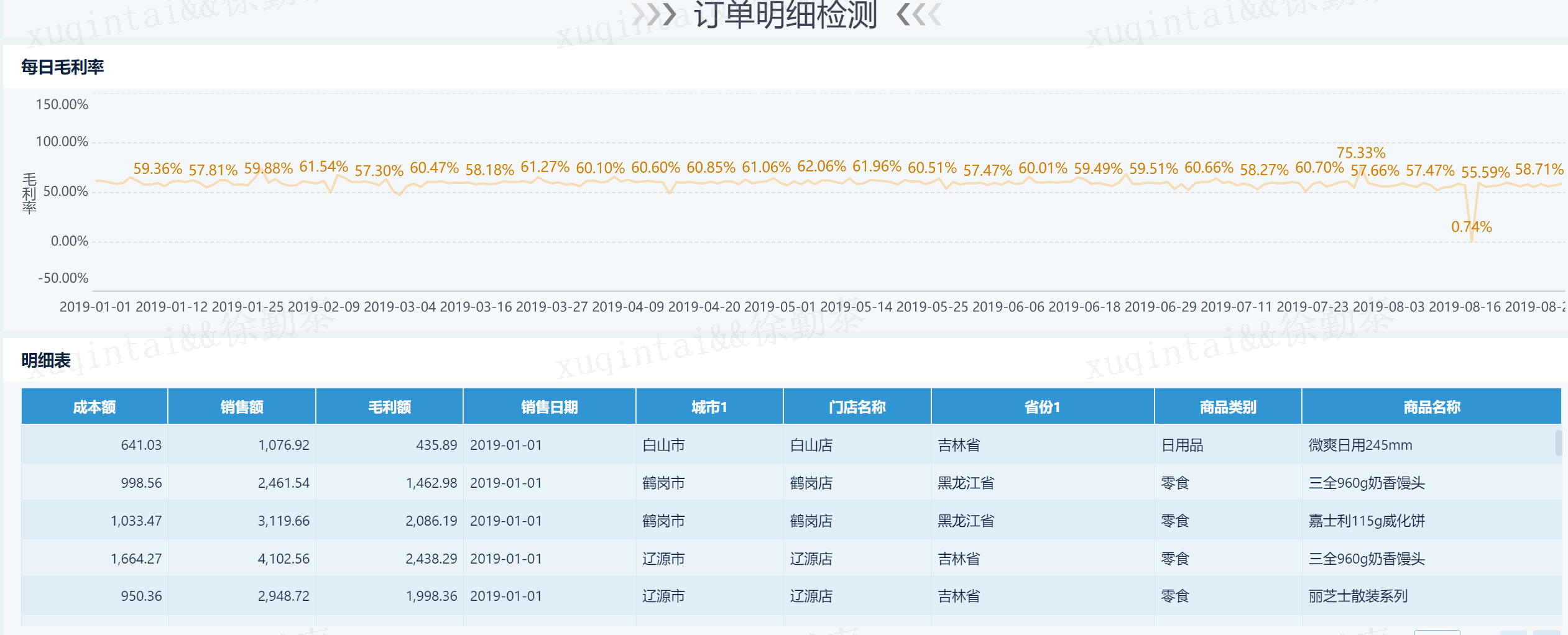 4、第四部分对每日利润率情况和订单明细进行检测,使用折线图和图标。