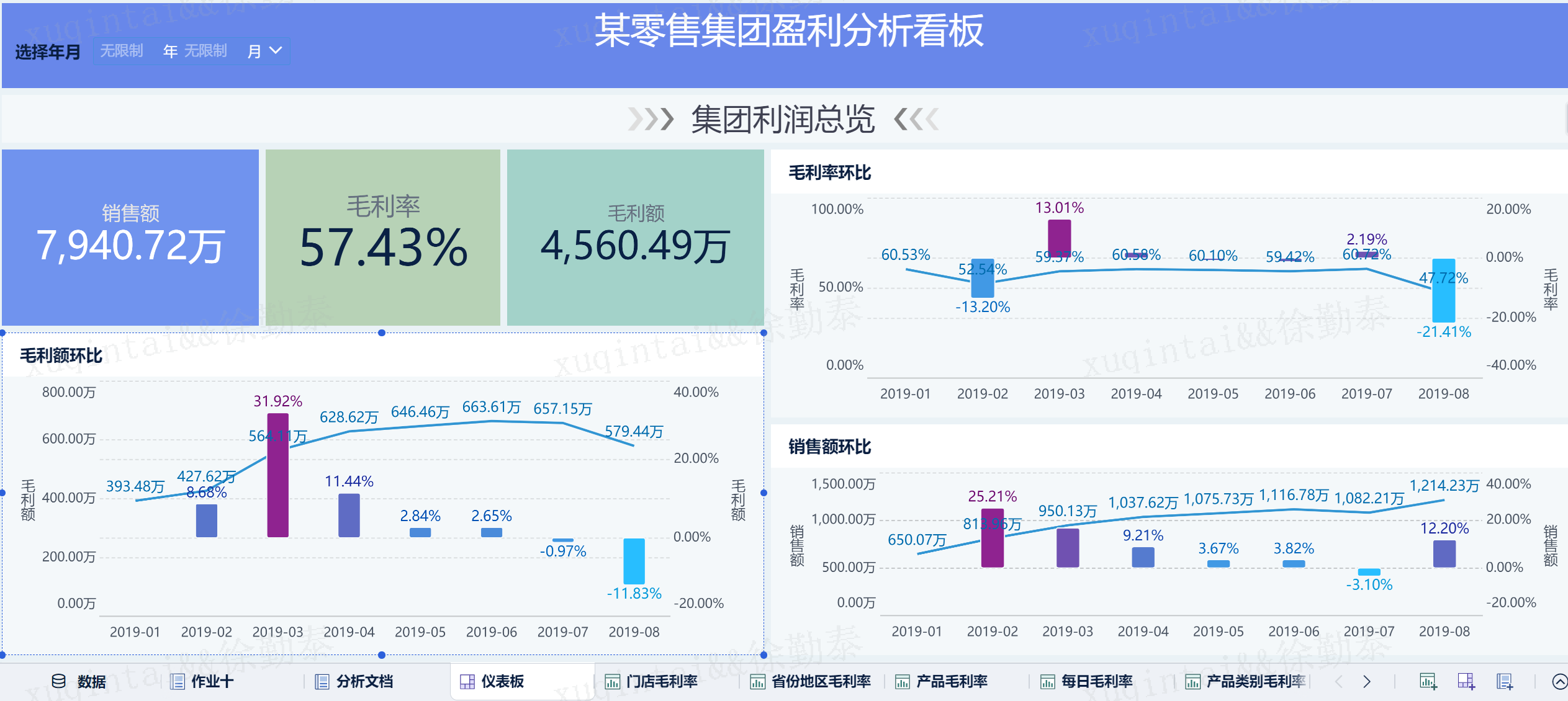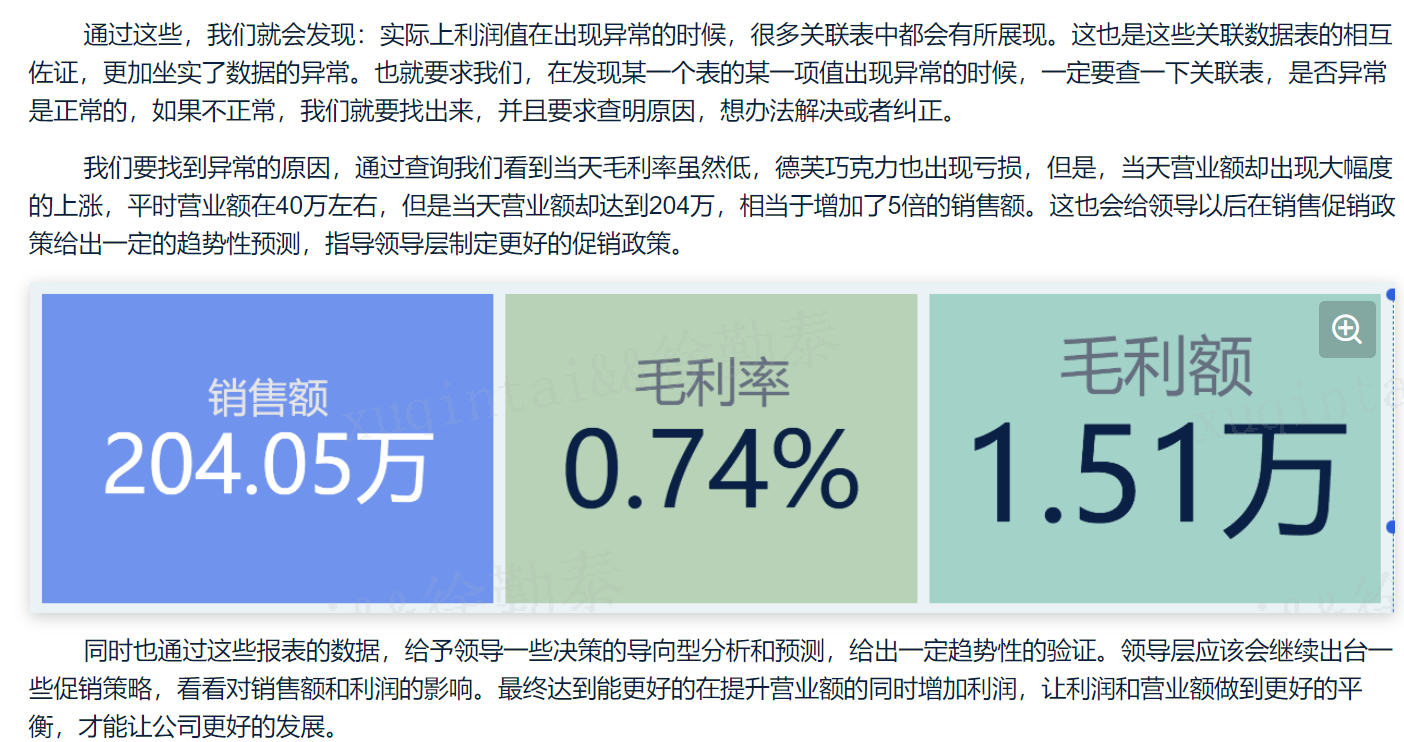 主要分四个版面:1、第一部分列出最核心的销售额、利润、利润率及相关的每个月的环比的指标卡和图标。