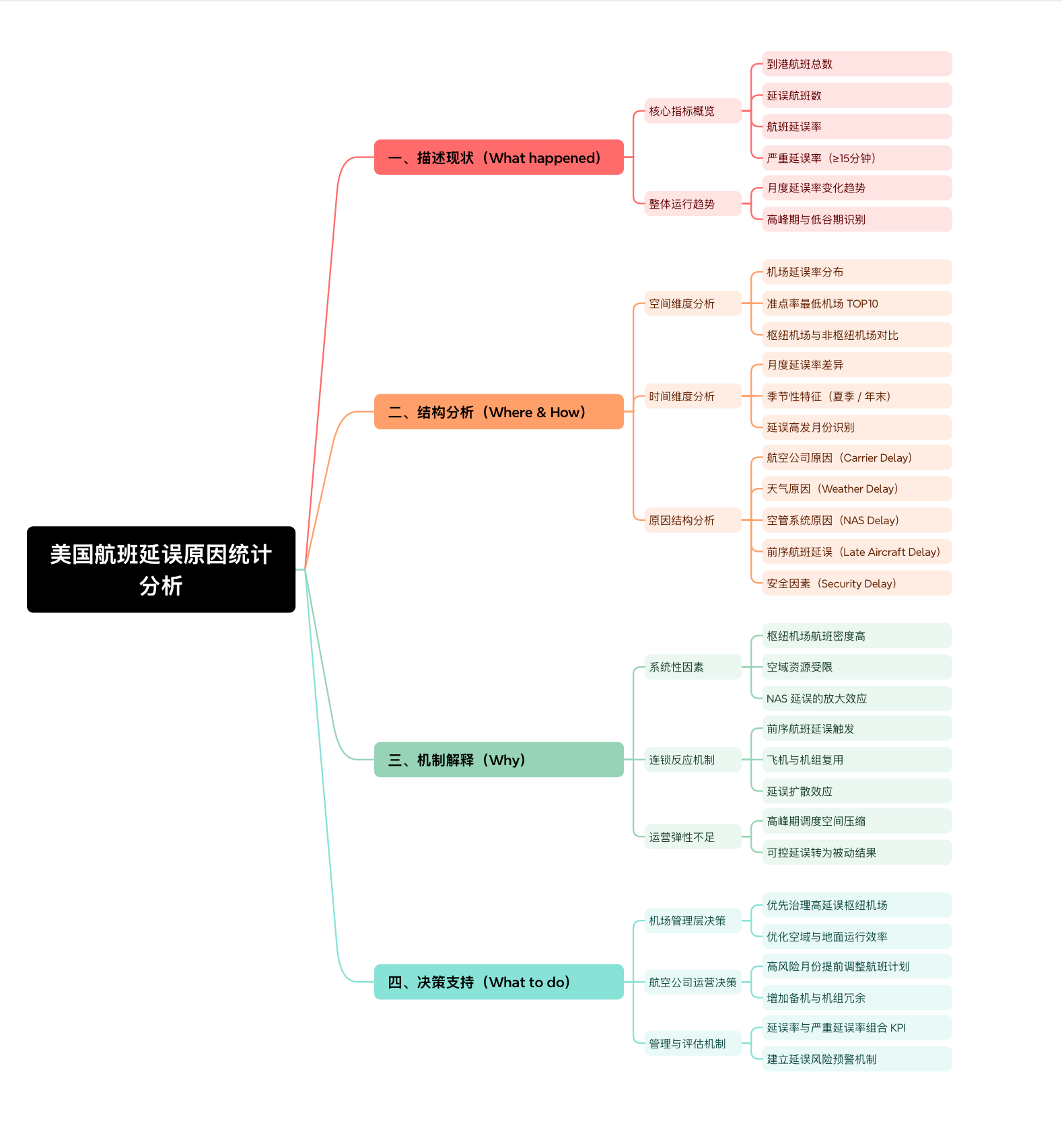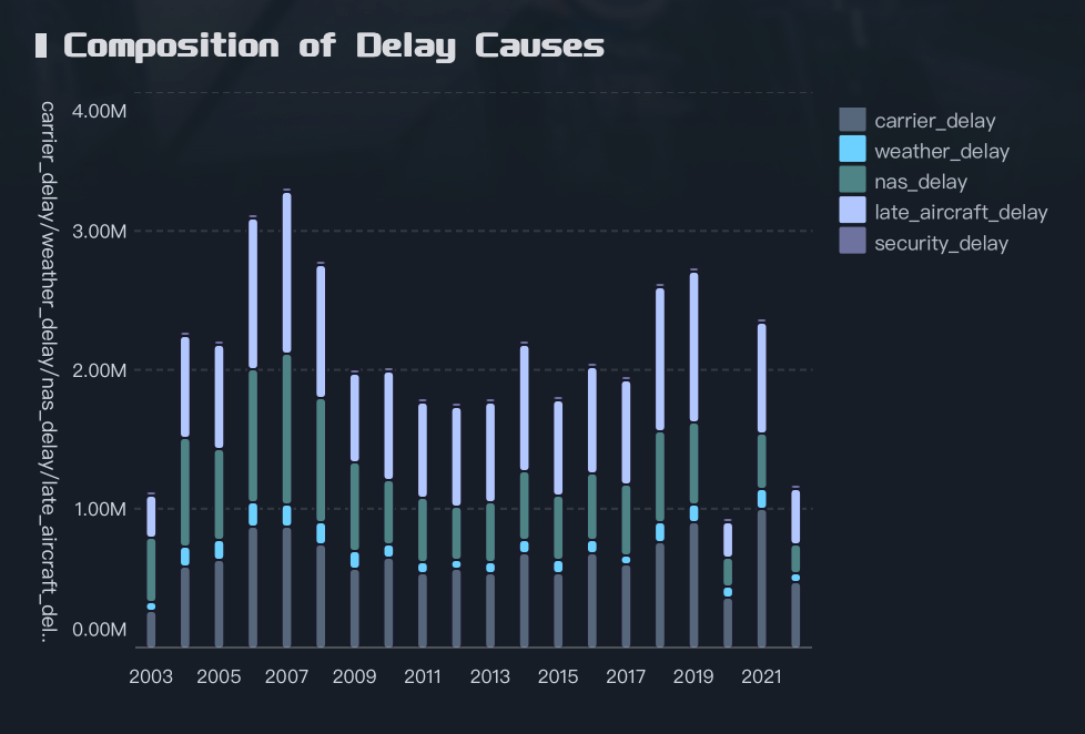 本次结业作品选题为 《美国航班延误原因统计分析》。作品基于公开航班运行数据,从整体运行情况、异常航班特征、机场差异、时间趋势及延误原因结构等多个维度,对航班延误问题进行系统分析,旨在: