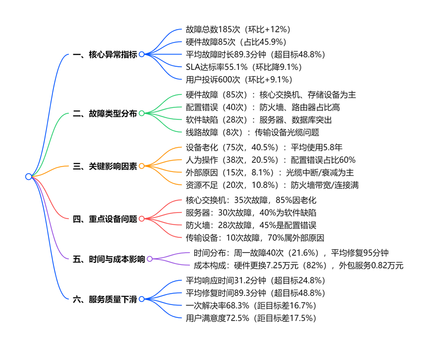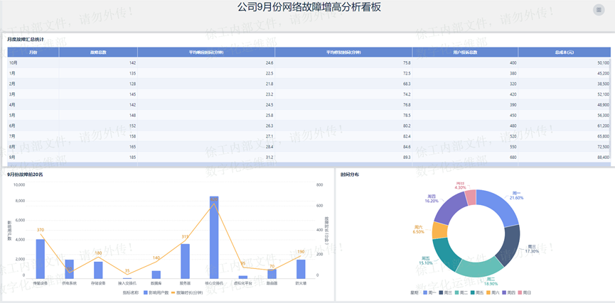 通过公司网络监控系统发现,9月份网络故障数达到185次,为年度最高值,较8月环比增长12.1%,达到年度峰值。为深入分析故障率异常升高的原因,我通过FineBI对9月份网络故障数据进行多维度分析,找出关键影响因素,并提出针对性改进建议。