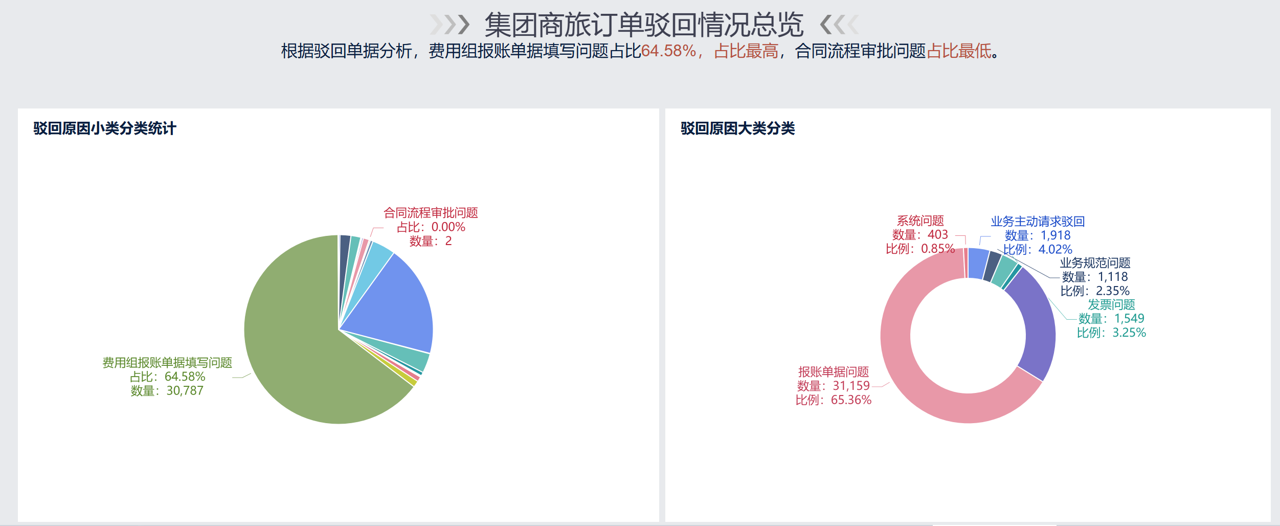 - 分析商旅订单驳回情况:分析商旅订单驳回的原因,找出驳回的出现最高频率的原因,并针对性的解决。