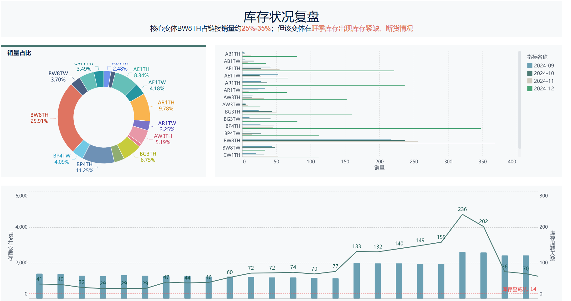 B.第二部分:库存状况盘点;饼图:呈现不同变体销售占比,后续联动,重点展示核心SKU问题;条形图:月维度展示销量变化,进一步体现销量问题;组合图:展示日库存和周转,联动展示库存问题;
