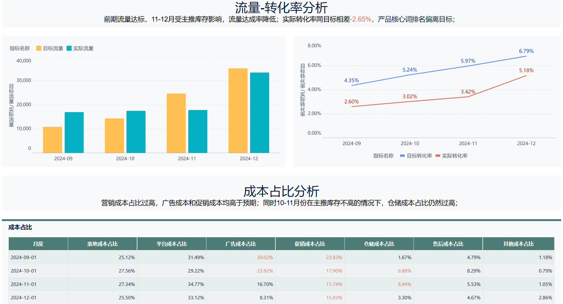 C.第三部分:流量转化率分析;通过柱状图和折线图直观展示流量、转化率差距,明确转化率问题;