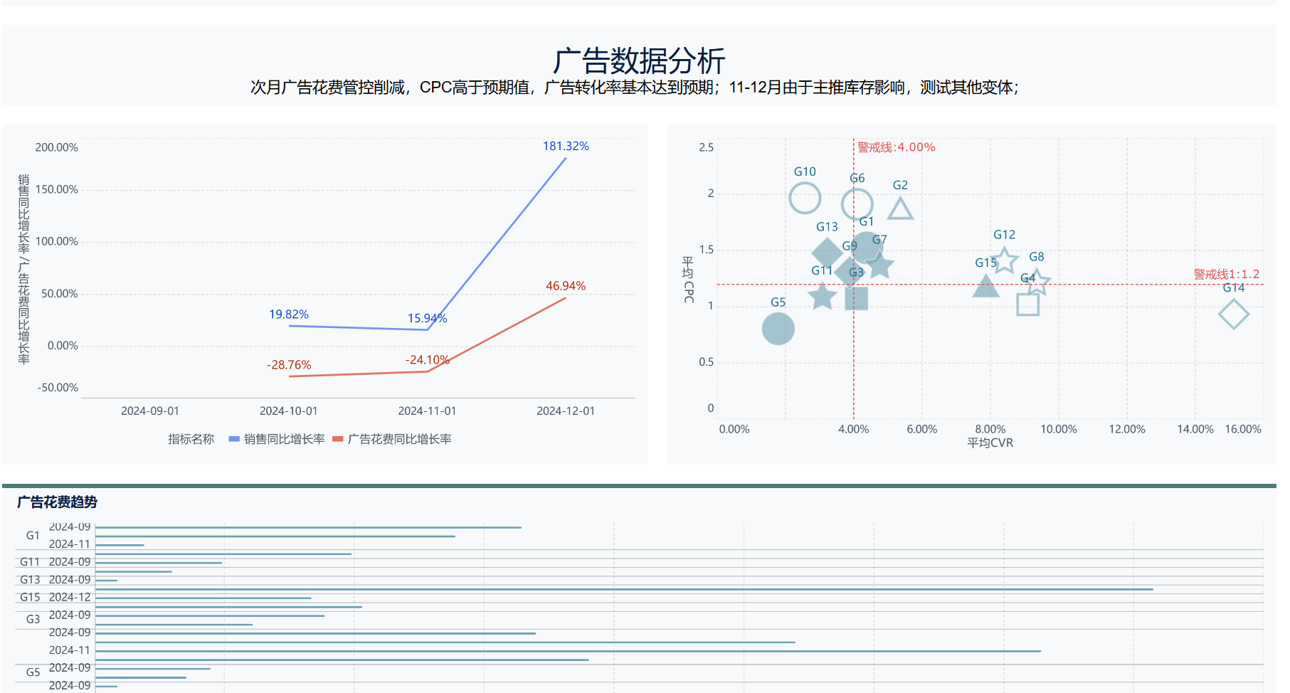 E.第五部分:广告数据分析;通过折线图:展示销量和广告变化,反映历史时段调整策略;通过散点图标注不同广告的效果,并进行联动;条形图;联动上图,体现不同月份的调整动作;