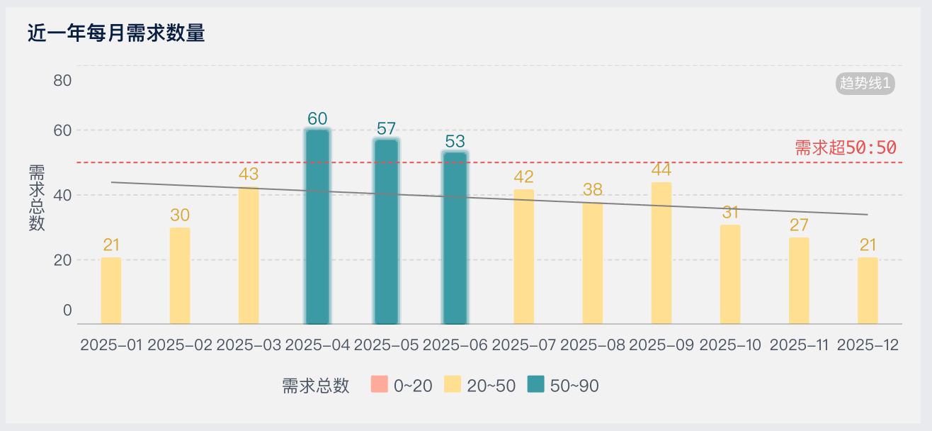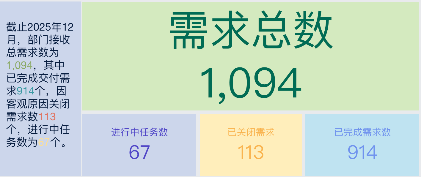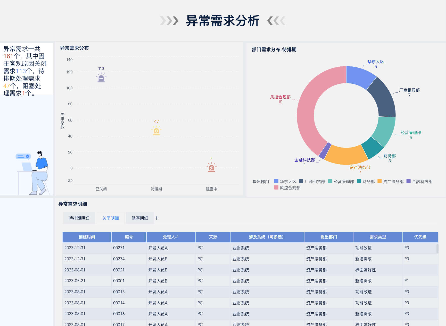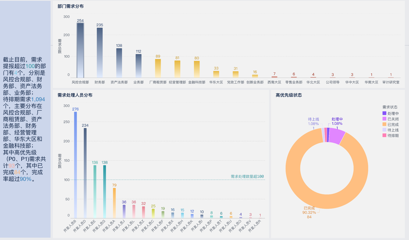 本次分析针对部门需求收集及研发过程管理,主要关注需求管理的关键KPI指标,包括研发的需求整体完成情况,近一年来需求收集研发趋势,高优先级需求完成情况,研发人员跟进情况以及异常需求的分布和明细管理。