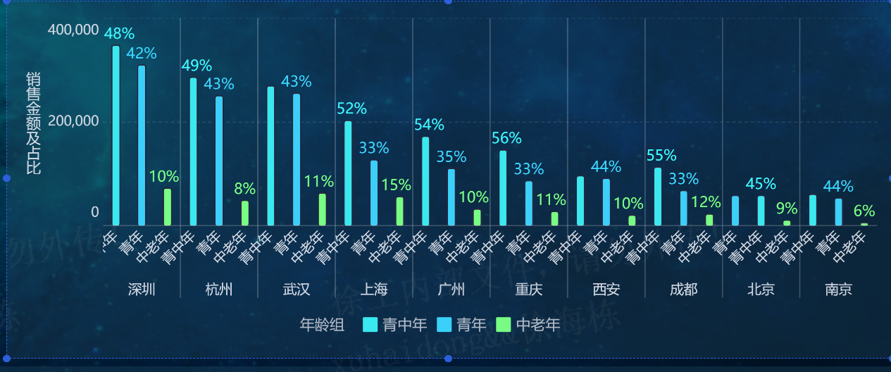 各城市年龄层销售结构柱状图:识别不同城市年龄覆盖短板。