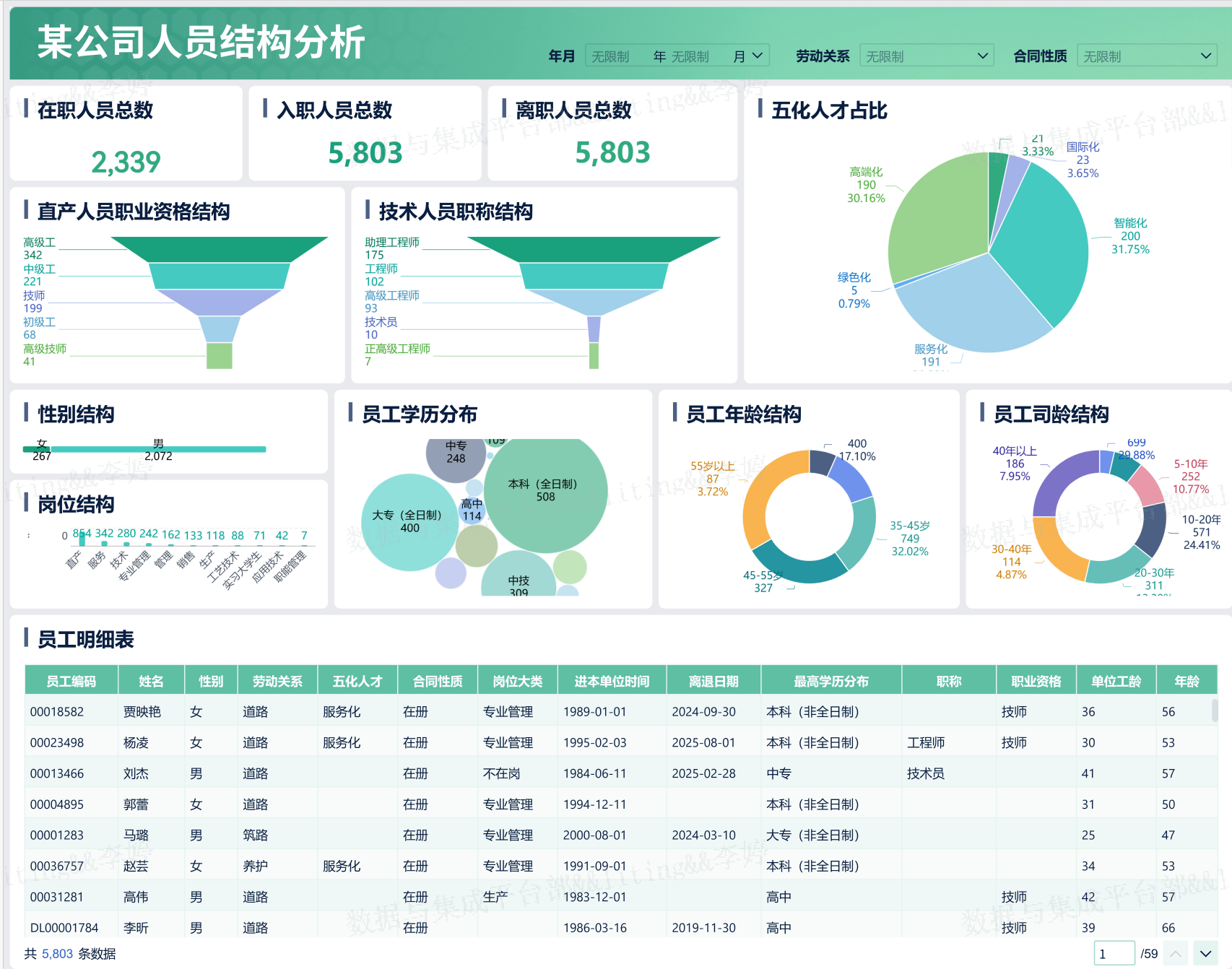 公司管理层希望全面了解现有人员构成状况,为人才战略、组织优化和人力成本控制提供数据依据。主要业务目标包括: