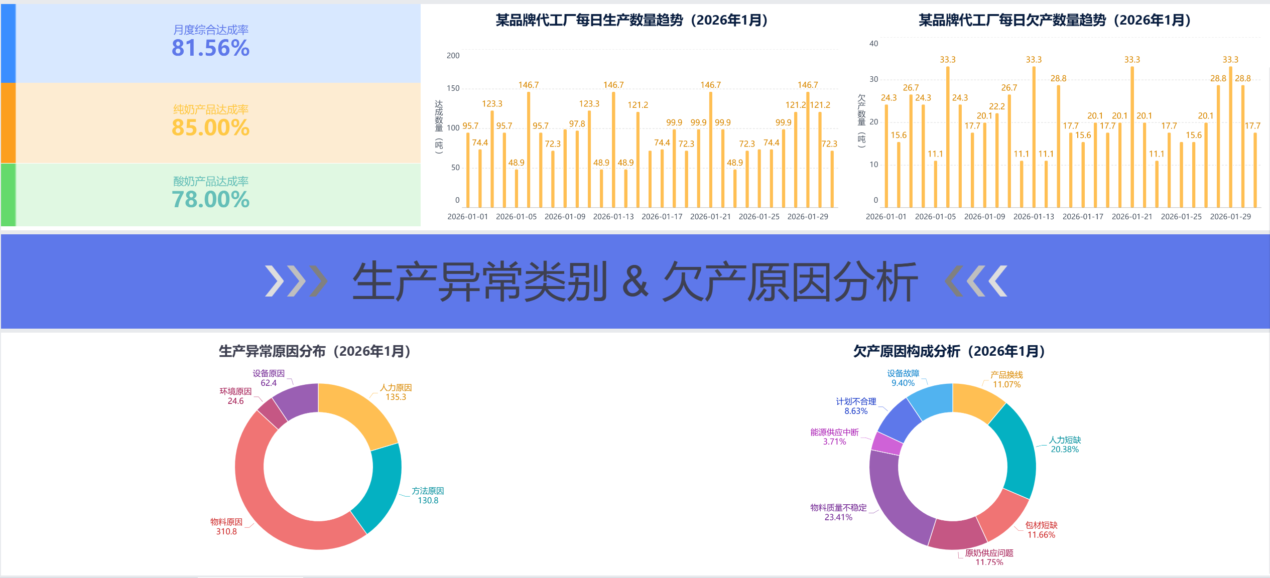 该公司主要生产纯奶酸奶产品,数据包含以下字段:计划日期、工厂名称、品种、品名、产品规格;计划数量、达成数量、欠产数量、未达成原因。