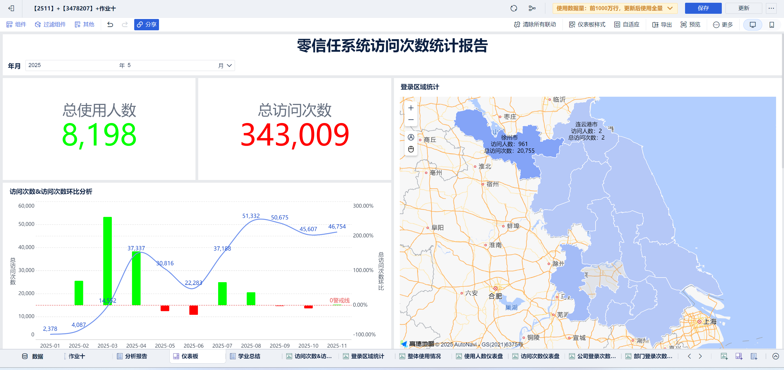 通过本次帆软 BI 学习,我我系统学习了各类可视化组件的应用场景与设计方法。包括基础的表格、柱状图、折线图、饼图,以及高级的雷达图、漏斗图、地图、散点图等组件,能够根据数据特点和分析目标选择合适的可视化形式。在报表设计过程中,我注重美观性与实用性的结合。学习了报表布局设计(自由布局、网格布局)、颜色搭配(遵循色彩心理学,确保数据区分清晰、视觉舒适)、字体选择与大小设置等设计原则,能够制作出布局合理、层次分明、易于理解的可视化报表。同时,掌握了报表交互功能的设置,如钻取(下钻、上钻)、联动、跳转等,实现了报表的动态交互,让用户能够深入挖掘数据细节。此外,还学习了报表的导出(Excel、PDF、图片)与分享功能,满足了不同场景下的数据展示与传播需求。不仅掌握了一款专业 BI 工具的使用技能,更实现了数据思维与分析能力的提升。在技能层面,能够熟练完成从数据源接入、数据处理、可视化报表设计到仪表盘制作的全流程操作,具备了独立开展数据分析项目的能力;在思维层面,培养了多维度、结构化的数据分析思维,学会了从数据中发现问题、分析问题并提出解决方案;在实际应用层面,能够将帆软 BI 技能与工作业务结合,为工作效率提升与决策优化提供了有力支持。