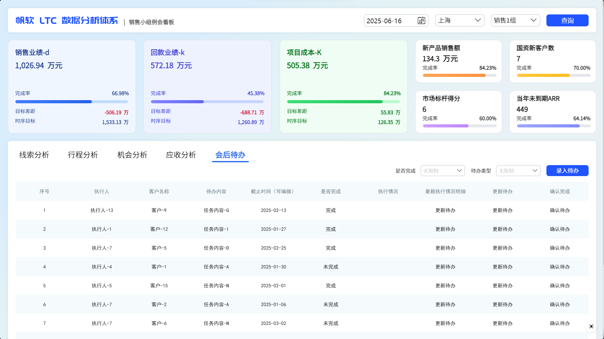 销售不是一锤子买卖,是跟客户处长期关系,会后跟进就是处关系的重要环节,这步要是漏了,客户转头就跟别人合作了。 从执行人、客户名称到待办内容、截止时间,事无巨细都得列清楚,是 “已完成” 还是 “未完成”,执行情况如何,一目了然。这就好比给每个待办贴了 “进度条”,谁该干啥、啥时干完,再也不会稀里糊涂。这样一来,销售小伙伴对着看板就能精准跟进,客户需求及时响应,成单机会稳稳抓住。