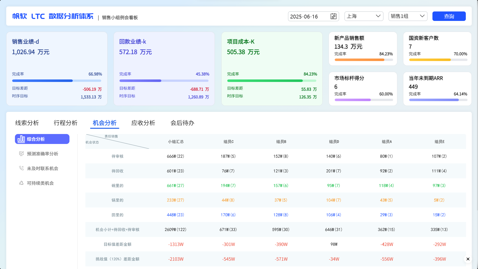 机会预测:盯紧 “机会预测准确率”,通过历史预测值与实际签约值的偏差分析,识别销售对商机阶段判断的能力差异,洞察签约机会。