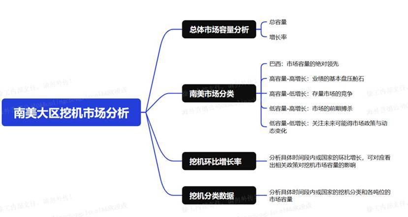 指标卡展示23年与24年市场总容量;地图直观展示各个国家的市场容量;用饼图展示各个国家的市场容量占比;散点图通过除巴西外的其他南美国家的平均增长率和平均市场容量来划分象限从而对南美除巴西以外的国家市场进行分类;柱状与折线组合图用来描述特定时间段内或特定国家的挖机类别和吨位的市场容量情况。