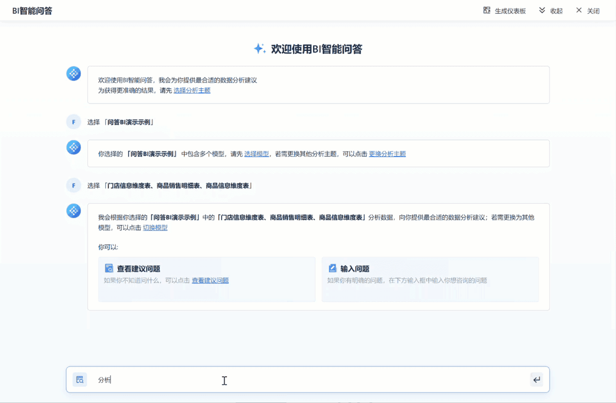 - 智能数据探索,需求精准匹配:具备智能数据探索功能,能够自动识别数据中的模式、趋势和关联。通过先进的算法和机器学习模型。FineChatBI会针对所输入的问题进行提前阅读,对于模糊的字段和意图不明确的问题,FineChatBI会通过模型匹配相似问题,生成分析思路和可视化组件。业务人员可以分析这些思路,判断是否满足需求,从而进⼀步提升问答精准度。如果不满意,可以选择推荐的类似问题进行提问。
