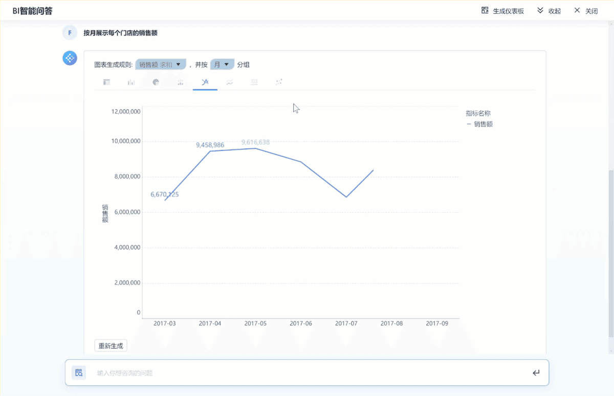 - 强大的数据可视化,呈现直观清晰:FineChatBI可以一键切换图表类型、开放图表生成规则,自定义切换图表指标及口径,以适应在问答过程中对指标口径的即时调整。在问答中,业务人员也可以随时干预意图解析过程,从而获得更准确的结果。因此,用户可以根据自己的需求和数据特点,选择最合适的可视化方式,让数据一目了然,决策更加迅速。