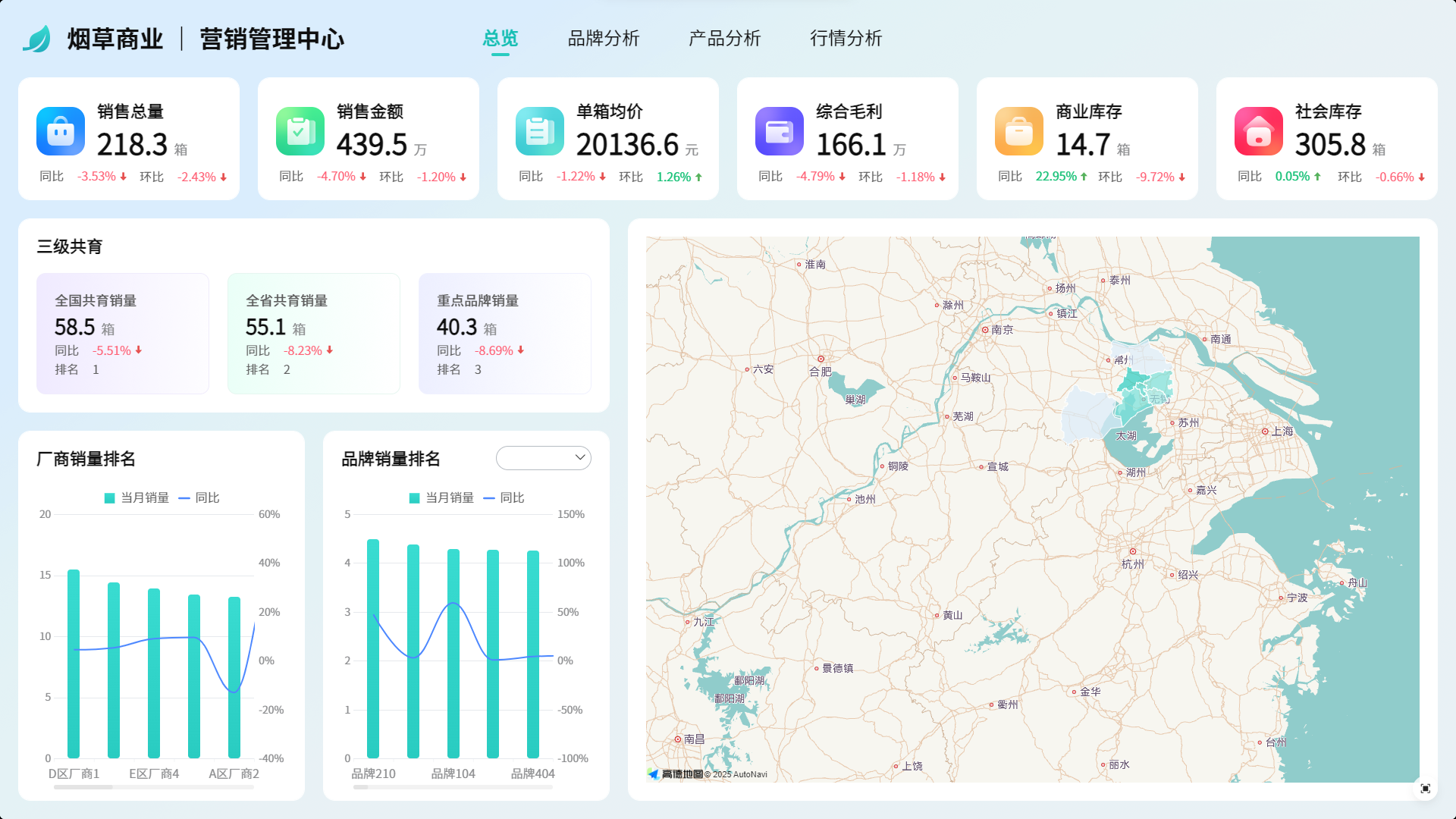 烟草商业端就像 “香烟销售员”,要管市场、管渠道、管物流,还要应对多变的消费需求,过去常被这些问题搞得头大:“这个月销量降了 3%,是南京烟卖不动还是苏州市场出了问题?”“物流车又晚点了,到底是堵在高速还是仓库没装完货?” 现在有了这些看板,这些难题通通有了 “数据答案”。