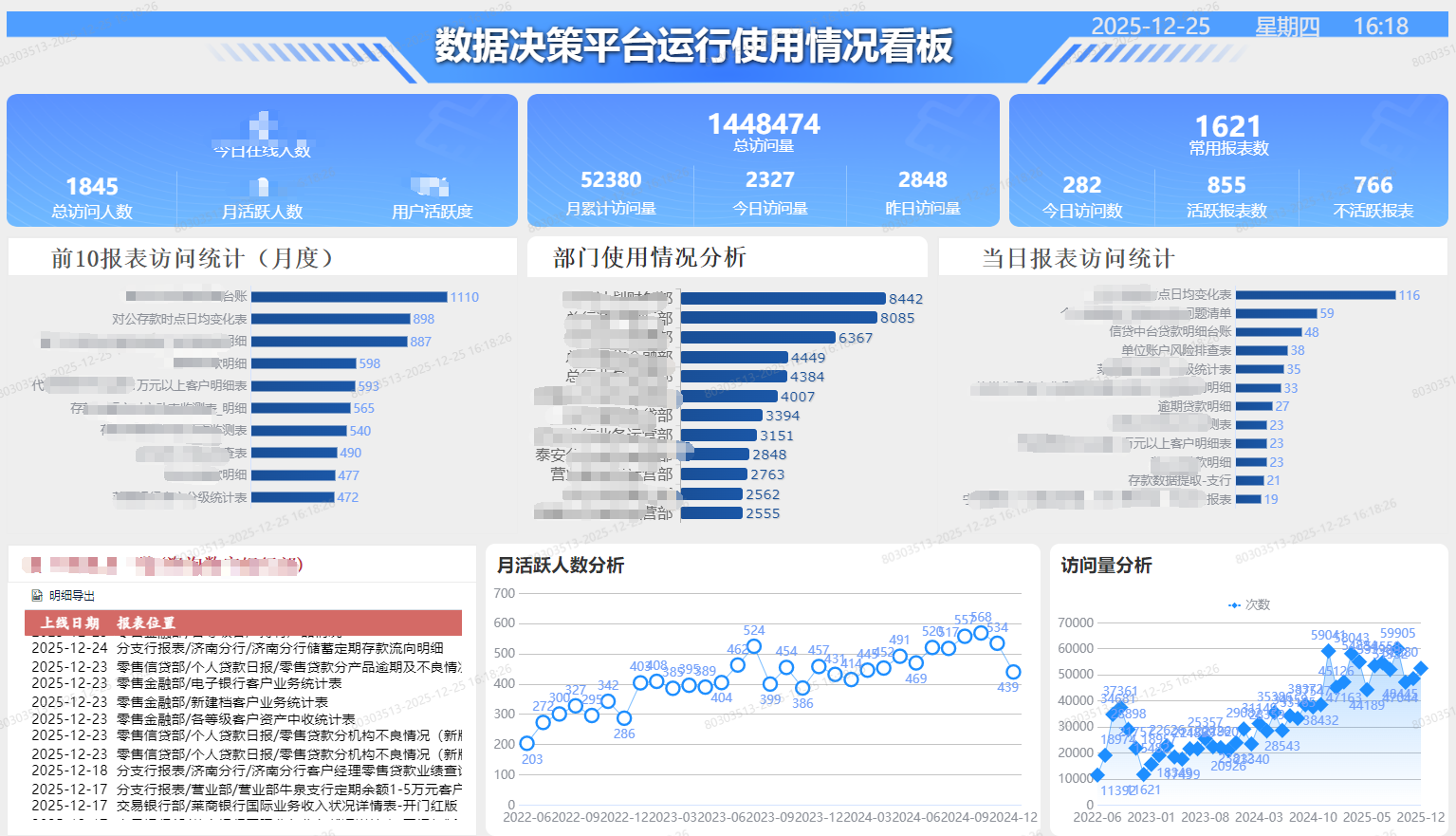 工作日中的普通一天,同事小A一上班就登陆“数据决策平台”,通过查询并下载“银行贷款情况表”,“银行分行贷款统计报”,“贷款五级分类统计表”等常用报表,开启了月初报表工作,仅仅不到30分钟,就完成了报表数据的收集和报送;但是3年前,完成这项工作需要一整天的时间,其中大部分时间是等着某报表系统跑批结束,然后登陆3个业务系统下载数据,最后整合分支行报送的手工台账数据。如今,我们为有如此便利的数据服务感到骄傲,更是得益于帆软强大的数据能力,包括数据同步、数据洞察和数据展现。仅自主开发报表一项,每年节省开发运维费用100万元,平均每月开发优化20余张报表,使得报表开发OA流程成为最活跃的办公流程,构建了数据需求,数据开发和数据展示一条龙服务。
