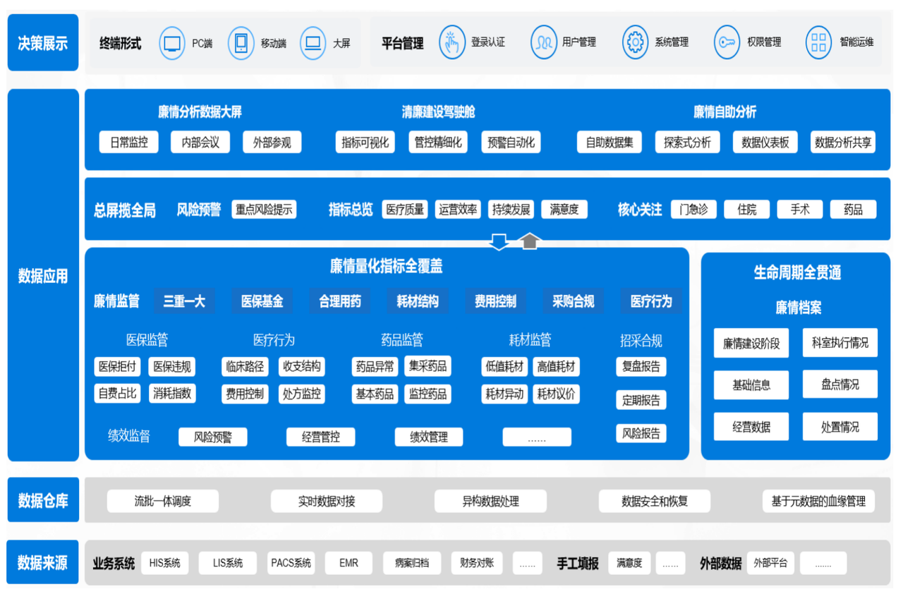 “五全五重”智慧监管平台是医院廉政监管数字化转型的核心载体,以医疗大数据与低代码开发技术为支撑,构建“决策展示层-数据应用层-数据仓库层-数据来源层”的四层架构,实现“监、管、控、评”全流程覆盖。在技术架构上,平台通过流批一体调度实现实时数据流与批量数据统一处理,整合结构化与非结构化异构数据,建立数据血缘管理体系,保障数据传输与存储安全;通过对接HIS、LIS、PACS、财务对账系统等内部业务系统,以及医保平台、药品集采平台等外部数据来源,累计抽取320个数据表12.8亿条数据,彻底打破数据孤岛。