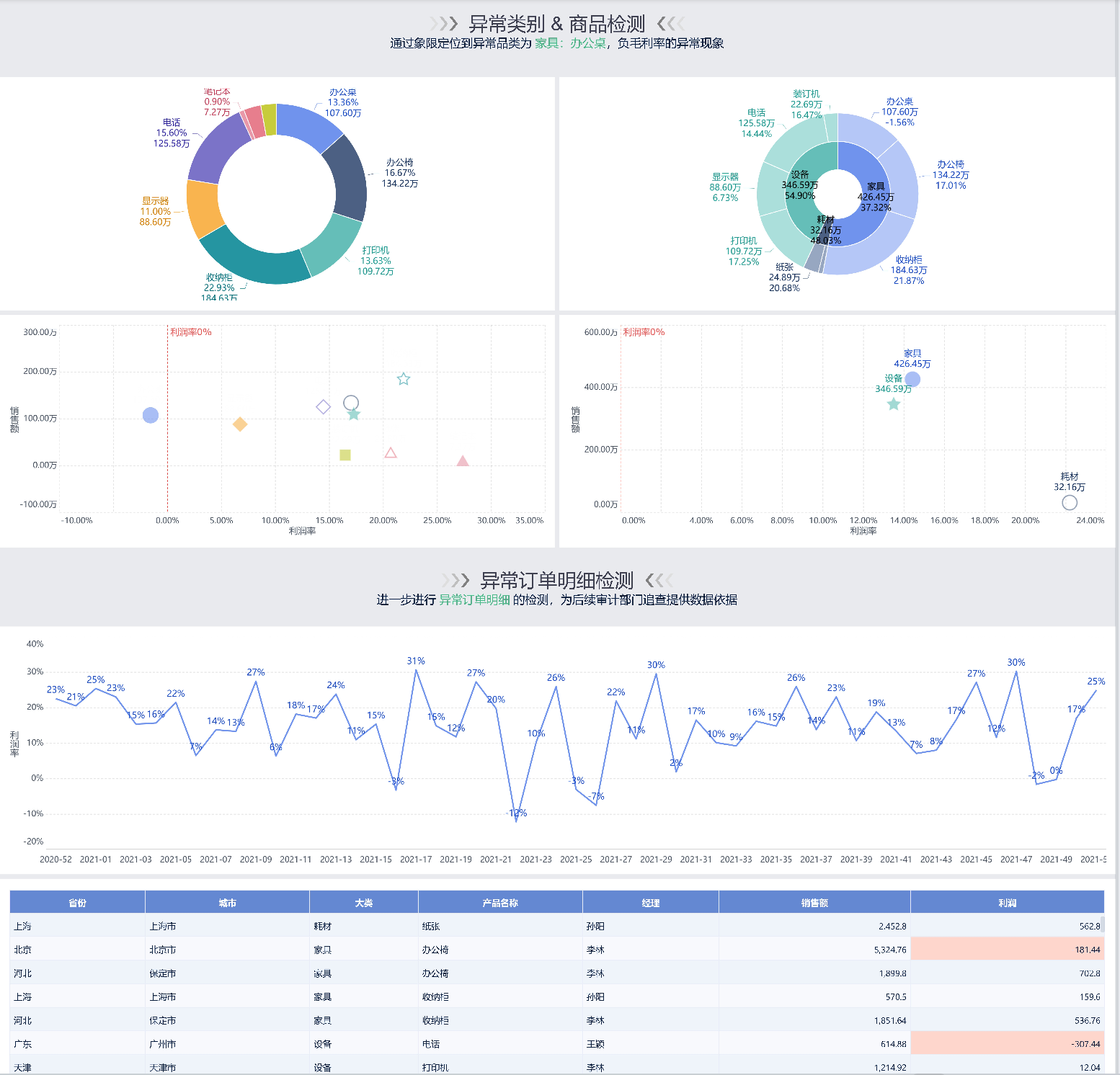 1、饼图:产品大类销售额占比,商品名称销售额和利润率占比