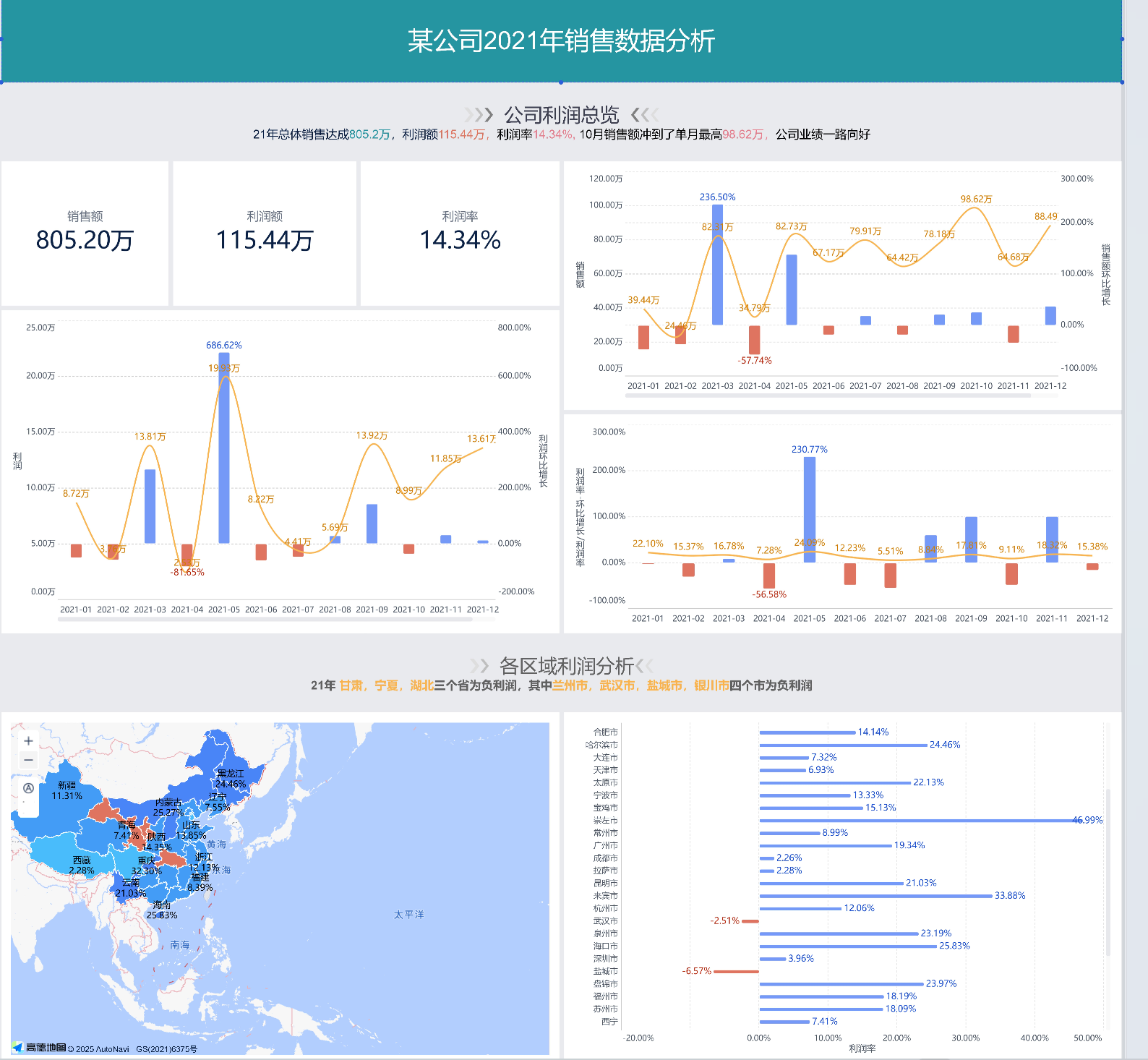 1、地图:省份利润率分布,条形图各市的利润排名