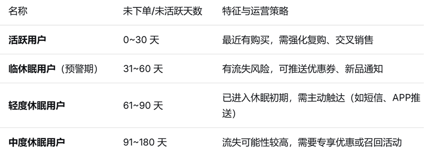 ②利用新增汇总列功能计算用户最近一次购买时间,再用时间差功能计算用户在休眠天数,按以下天数对用户进行分类标记。
