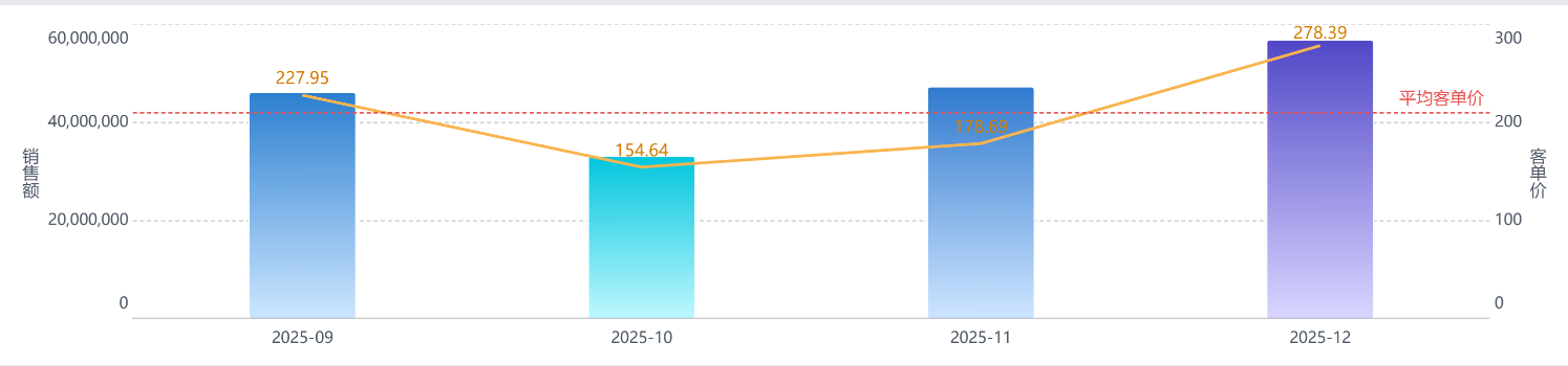 3、 柱形图|折线图:柱形图显示每个月销售额折线图显示客单价,并且设置从年月到年月日的钻取