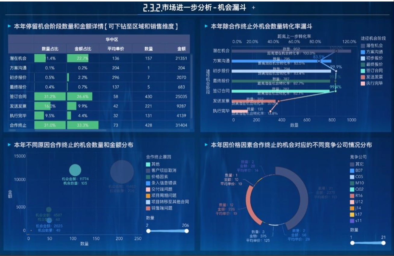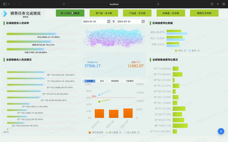 我不再只是一个被动的工具使用者,而是成了那个借助 FineBI,将数据中台里的 “原材料” 加工成各类决策仪表盘的 “数据厨师”。销售的收入目标达成率、收入的同环比分析、销售机会的全阶段转化、生产的核心指标等,需求接踵而至。我开始系统地学习如何把模糊的业务问题,拆解成清晰的数据指标,再用 FineBI 做出动态、可钻取的分析看板。