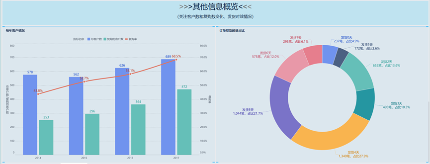 1、组合图-每年总客户数、复购客户数、复购率,展示客户趋势;