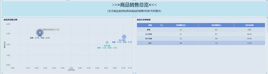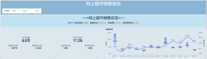 1、KPI指标卡: 当月销售额(销售环比率、销售同比率),当月毛利率(毛利率环比、毛利率同比)。