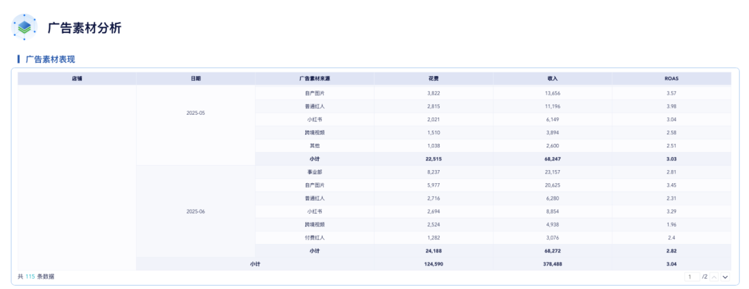 - 广告素材表现:对比各素材的花费、收入 、ROAS,快速找出有效素材与需要下架的素材。
