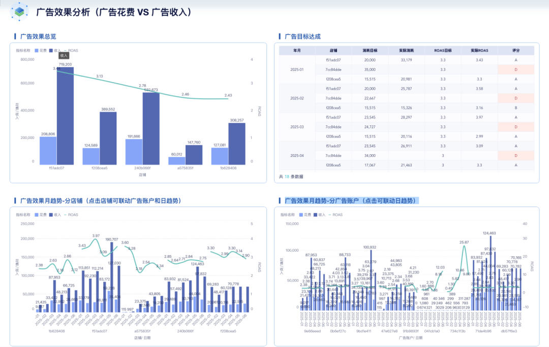 - 广告花费占比变动—分店铺:识别哪个店铺投放收益高、哪个占比偏高影响利润。