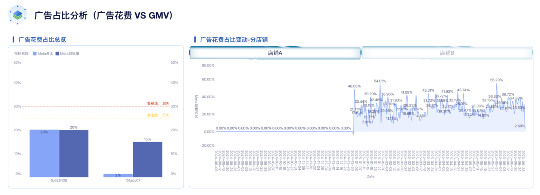 - 广告花费占比总览:判断投放比例是否健康,识别 GMV 是否依赖广告。