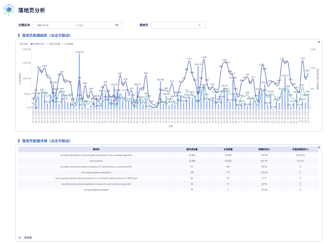 - 趋势分析 重点关注页面的停留时间、浏览量、会话数等核心指标,判断页面是否具备足够的吸引力与互动性。