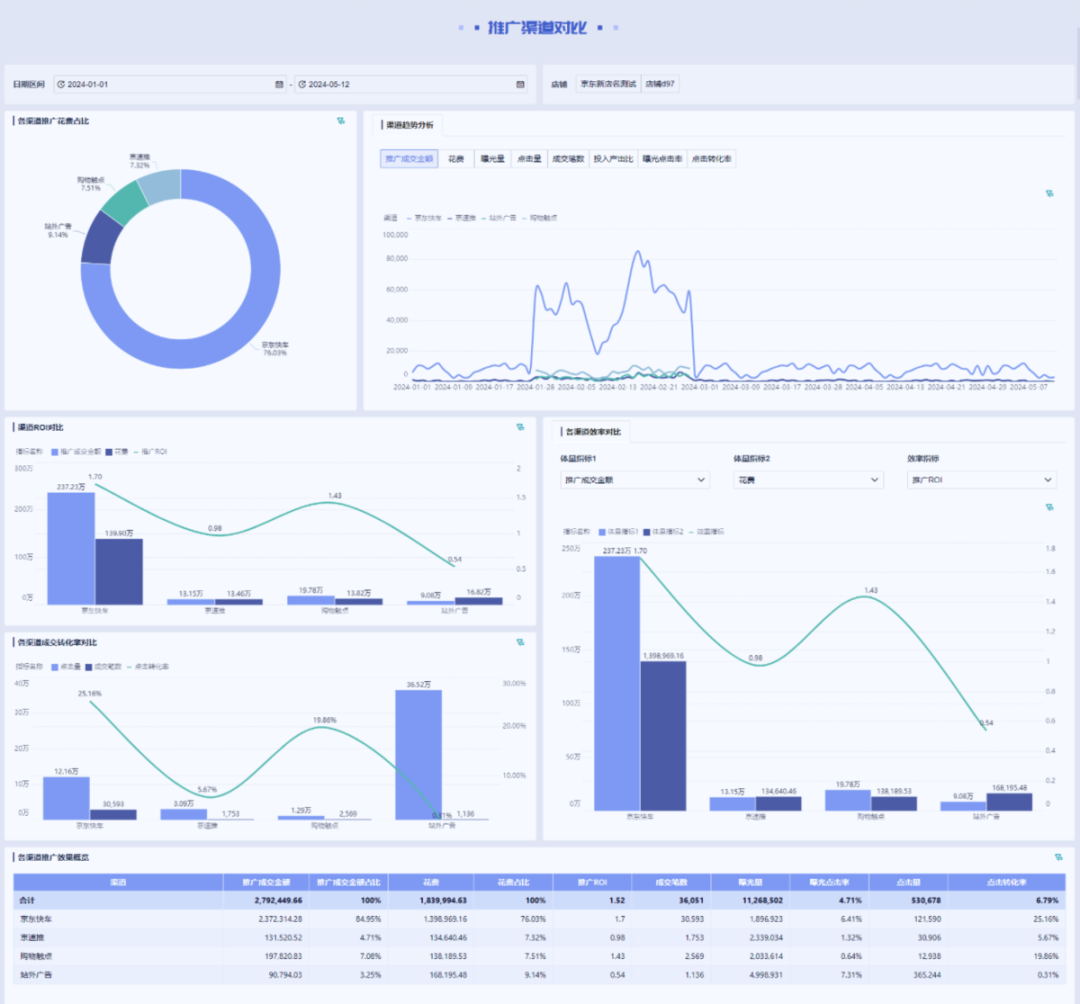 基于九数云 BI 对京准通数据的直连能力,商家可以围绕「整体投放—渠道结构—商品表现」三大层级,系统化分析京东推广效果,而不是只盯单一指标做判断。