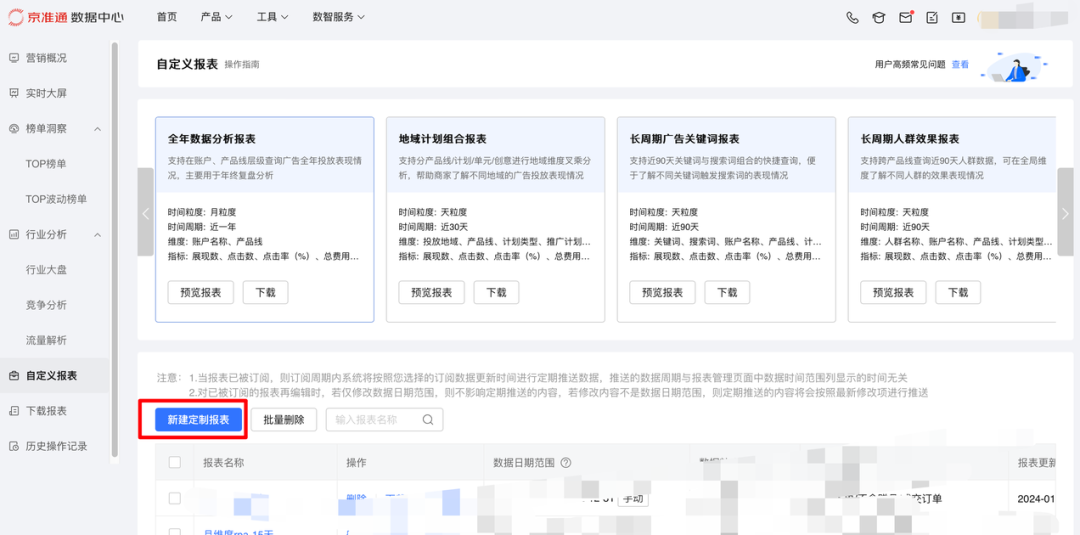 九数云 BI 支持对接的京准通的自定义报表数据,获取包括但不限于: