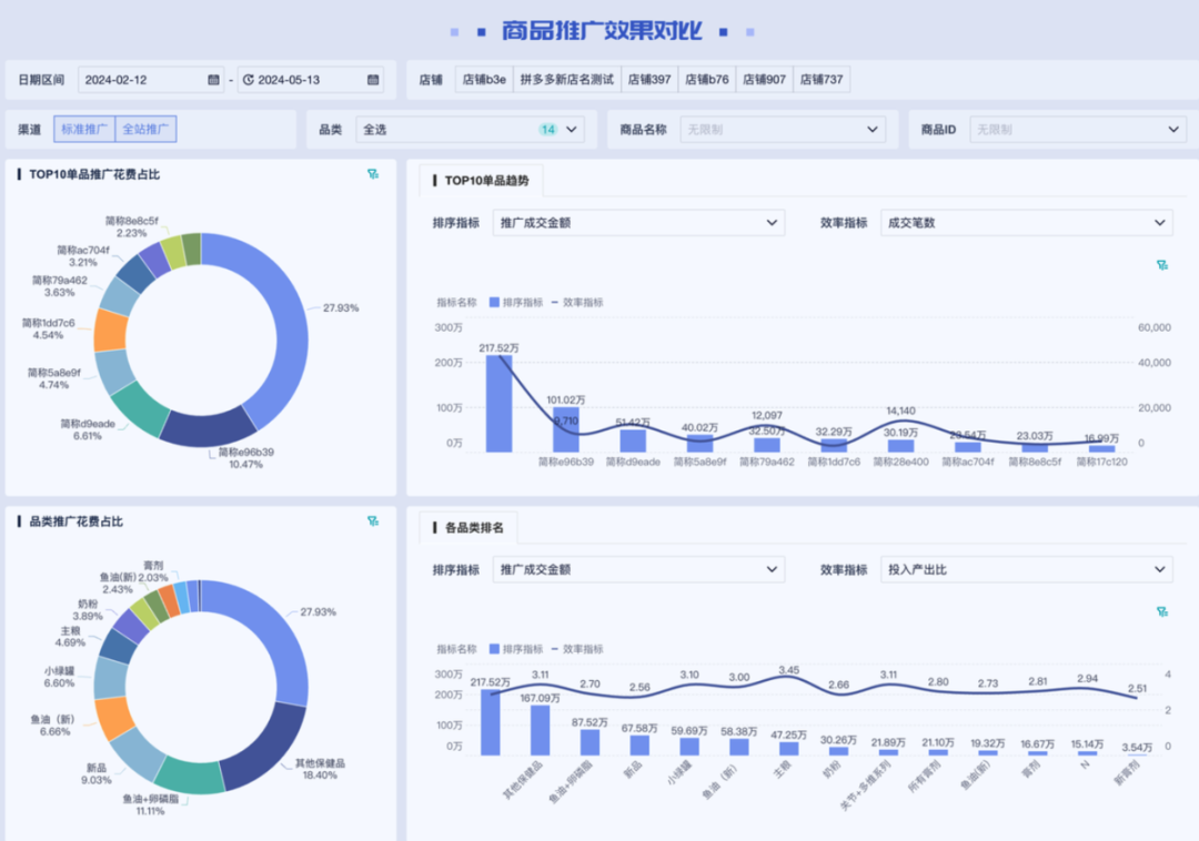商品推广效果对比模块,重点用于识别 高投入商品、高回报商品以及潜在浪费点,帮助商家优化商品投放策略。