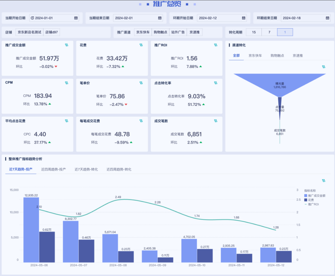 结合日期、周期、店铺、转化周期、推广渠道等筛选条件,运营可以灵活切换视角,快速定位异常波动与关键变化节点。