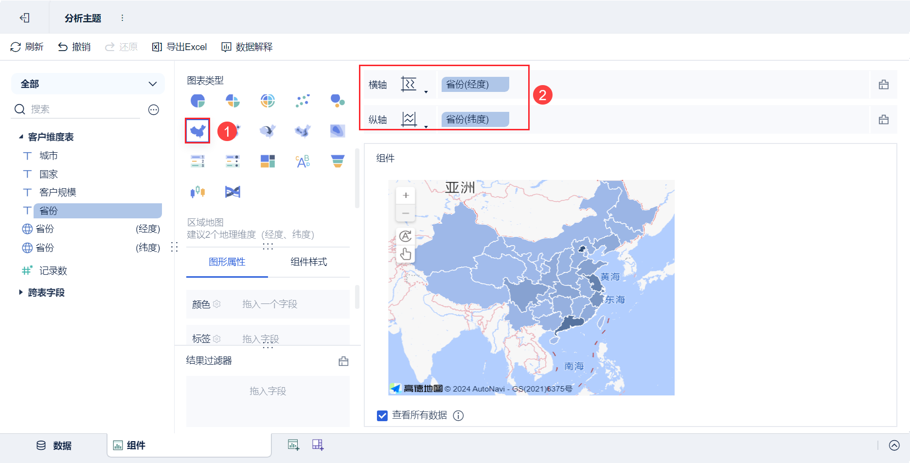 地图组件设置:检查地图组件的设置,确保已选择正确的地图类型,并且经纬度字段已正确拖入横轴和纵轴。