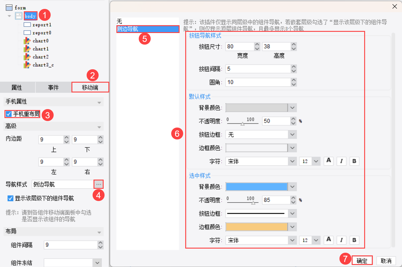 点击导航样式旁的「...」按钮,选择「侧边导航」,配置具体设置项。
