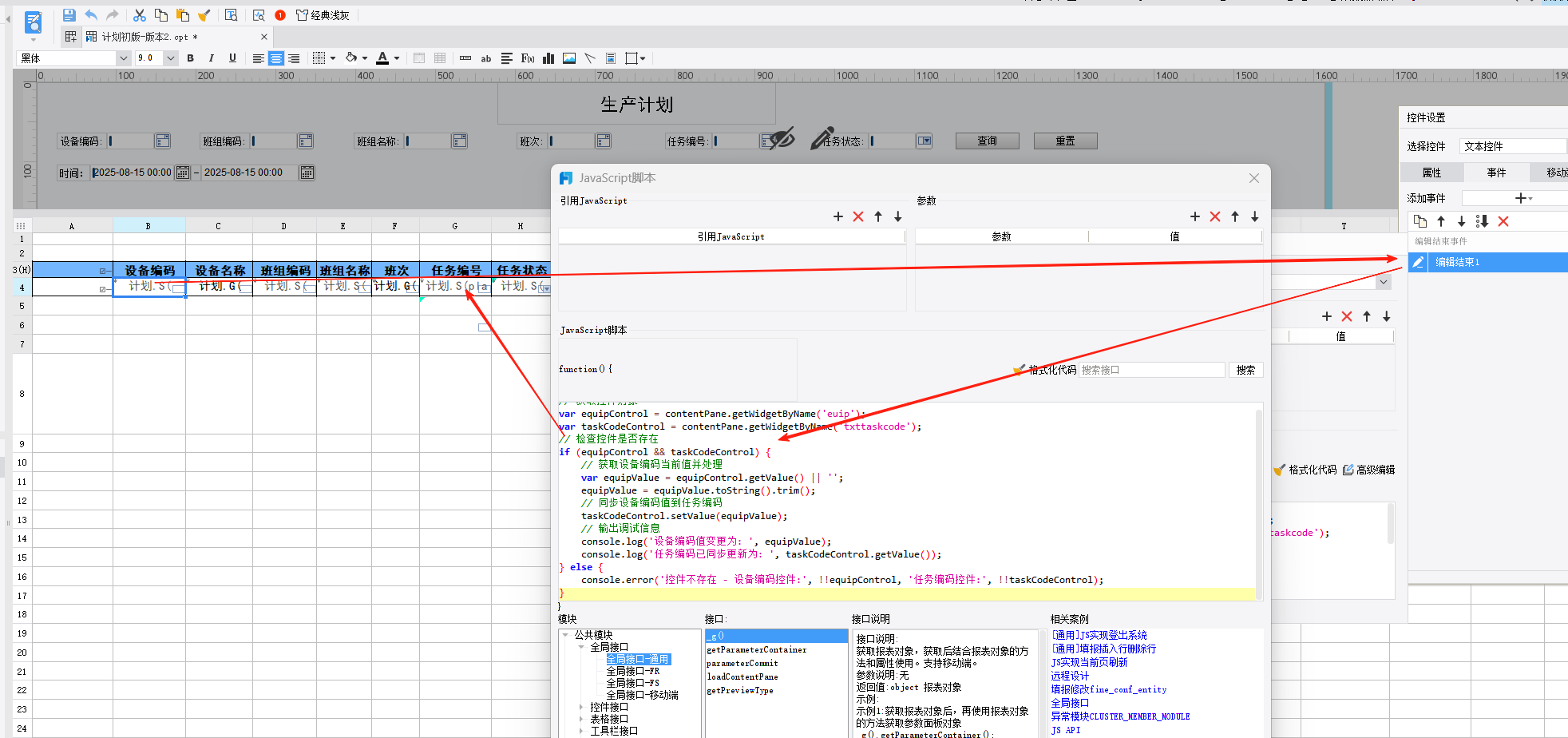 // 获取控件对象 var equipControl = contentPane.getWidgetByName('euip'); var taskCodeControl = contentPane.getWidgetByName('txttaskcode'); // 检查控件是否存在 if (equipControl && taskCodeControl) { // 获取设备编码当前值并处理 var equipValue = equipControl.getValue() || ''; equipValue = equipValue.toString().trim(); // 同步设备编码值到任务编码 taskCodeControl.setValue(equipValue); // 输出调试信息 console.log('设备编码值变更为: ', equipValue); console.log('任务编码已同步更新为: ', taskCodeControl.getValue()); } else { console.error('控件不存在 - 设备编码控件:', !!equipControl, '任务编码控件:', !!taskCodeControl); } |