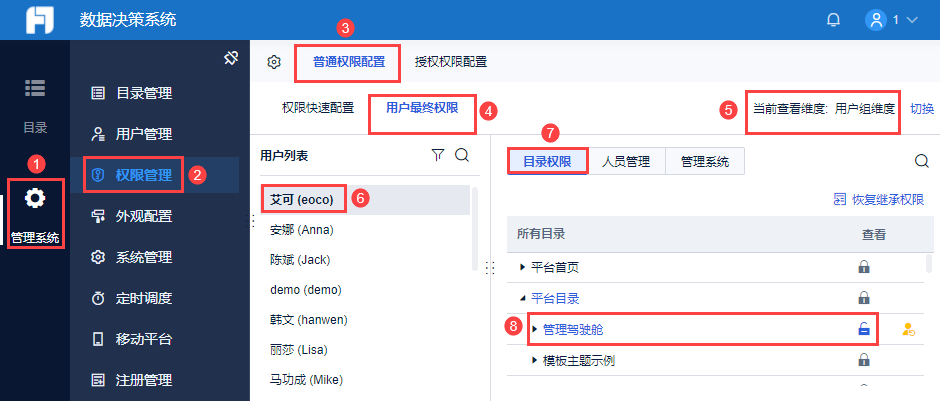 配置目录查看权限:为该用户分配目录「管理驾驶舱」的「查看」权限,如下图所示: