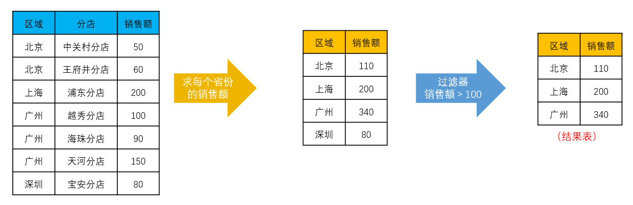 场景:先计算每个省份的销售额总和,再筛选出销售额大于100的省份。