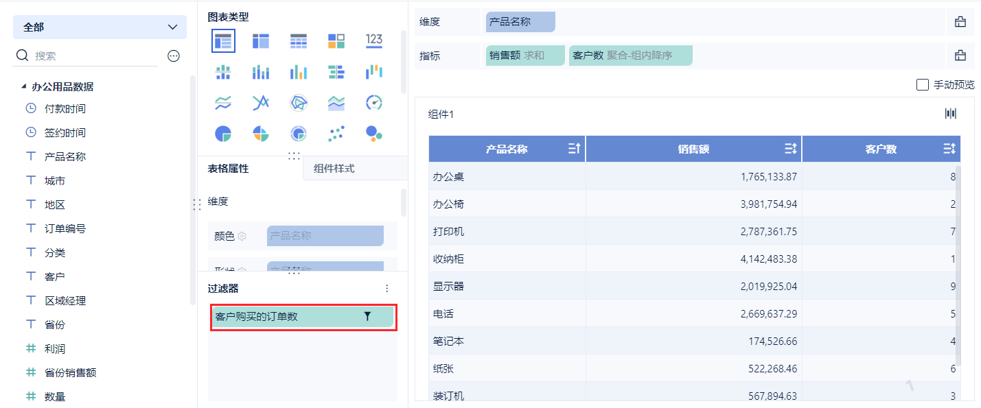 在过滤器中设置条件(如“客户购买的订单数≥2”)。